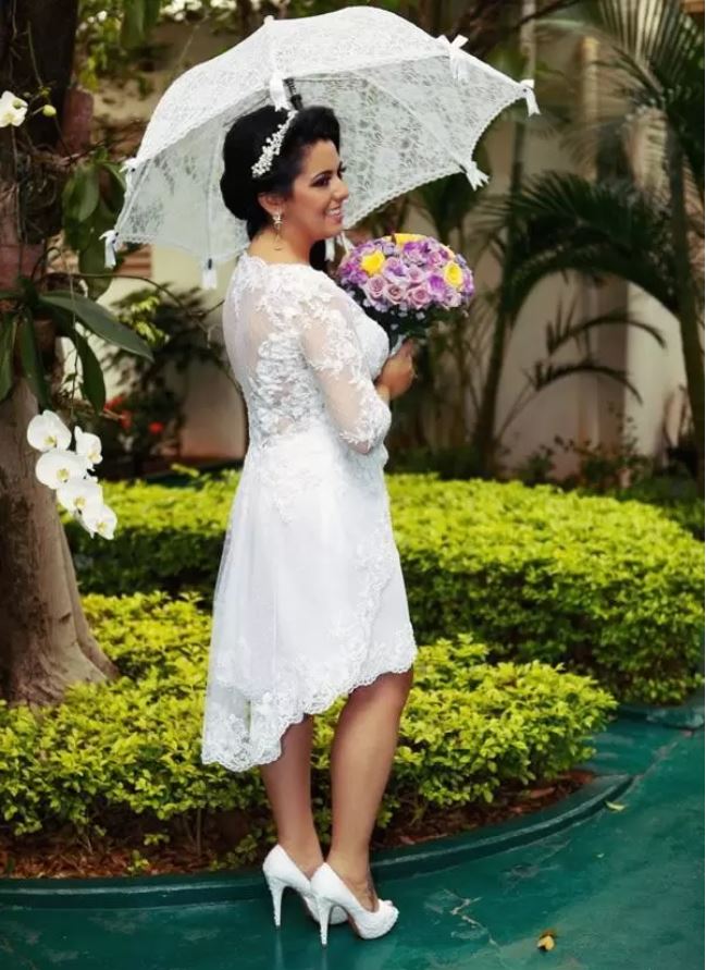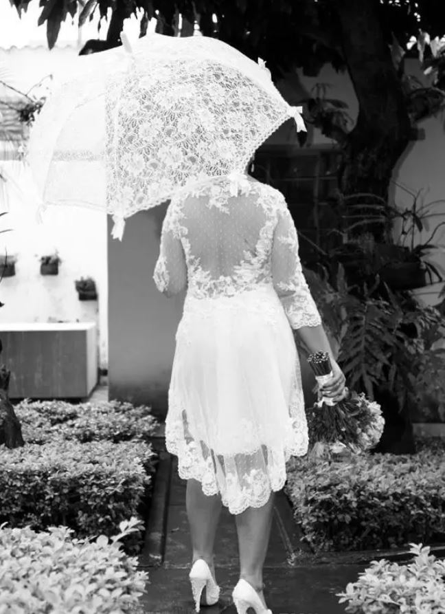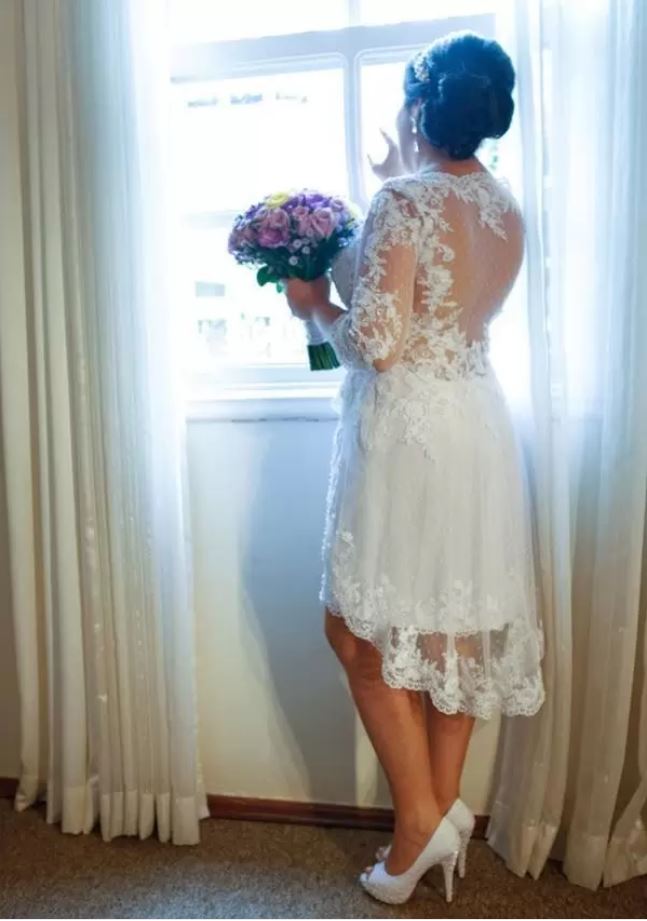 New Plus Size High Low Wedding Dresses High Low 3,4 Sleeve V-Neck Lace Tea Length Short Bridal Gowns