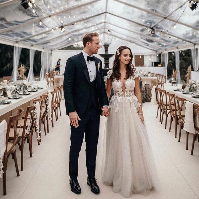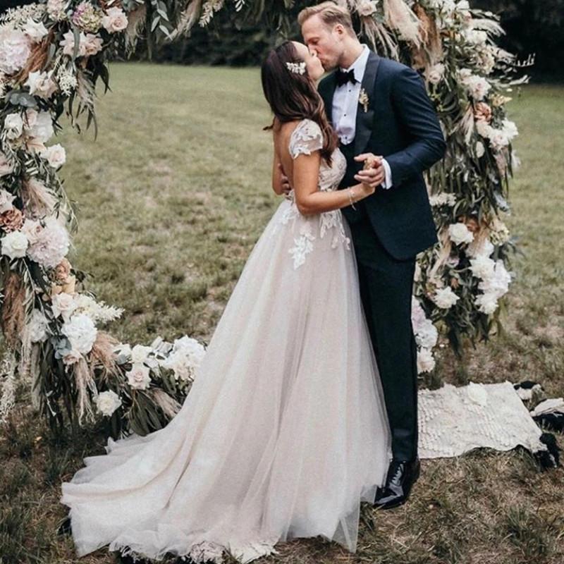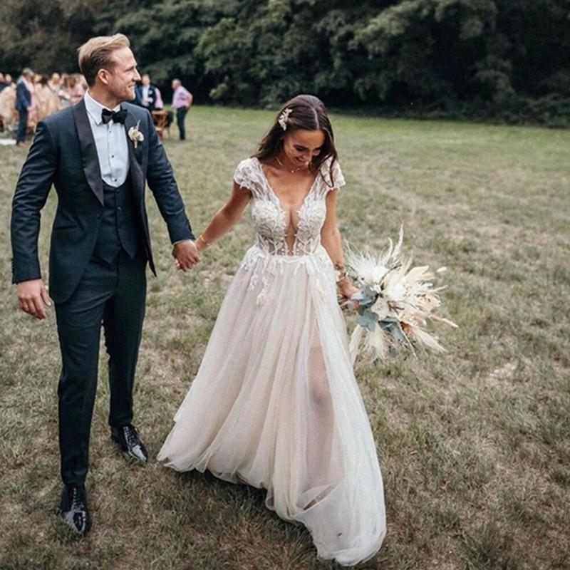 Bohemian A Line Beach Wedding Dresses Deep V Neck Short Sleeve Appliques Bridal Dress