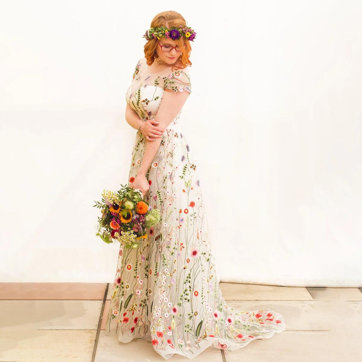 Short Cap Sleeves Embroidered Wildflower Colorful Wedding Dress Illusion Round Neck Custom Made Corset Blossom Bridal Gowns