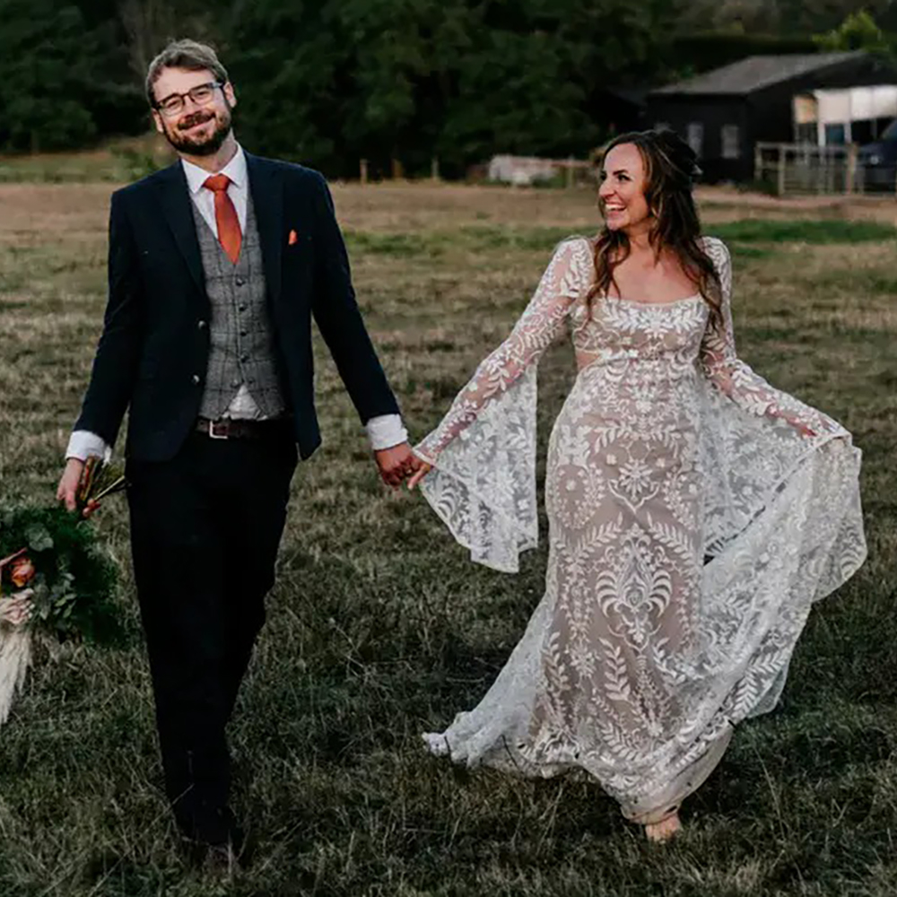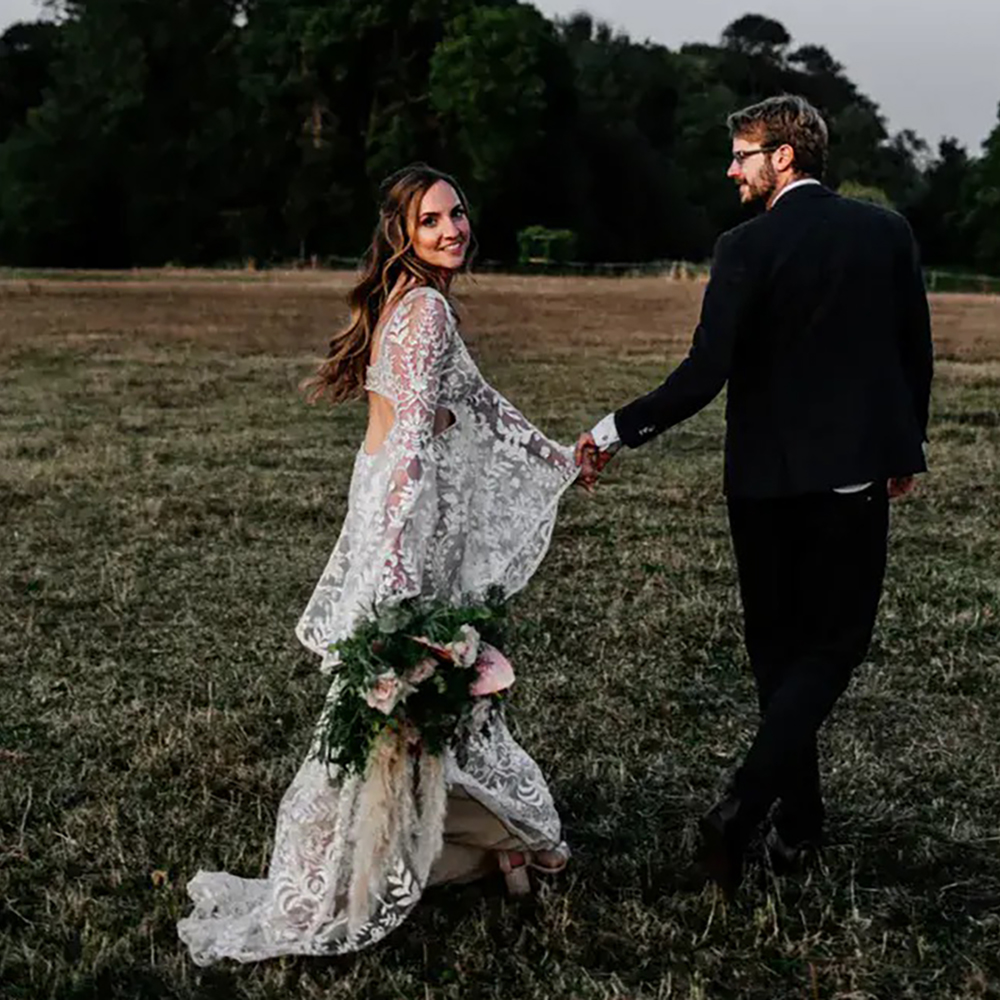 Boho Long Batwing Sleeves Lace Wedding Dress Drop Ship Custom Made Mermaid Rustic Beach Square Neck Open Back Bridal Gowns