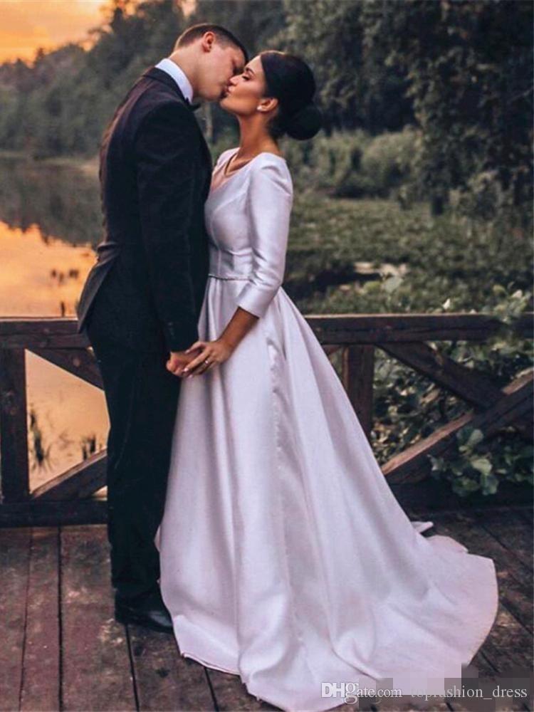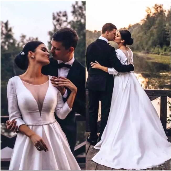 Simple Satin Wedding Dresses 3/4 Long Sleeves Plunging Illusion Scoop Neck Beaded Crystal Waist Wedding Gowns