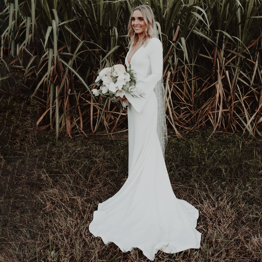 Deep V Neck Long Flare Sleeves Satin Micro Wedding Dress Simple Custom Made Backless Plus Size Mermaid Soft Garden Bridal Gown