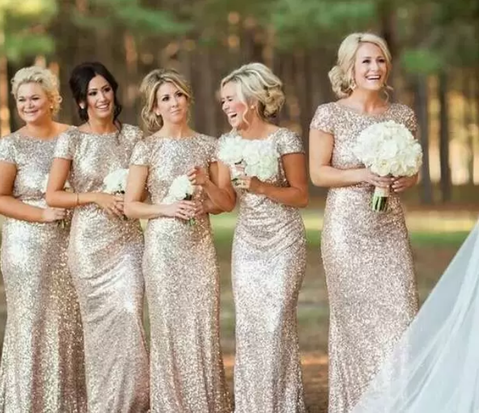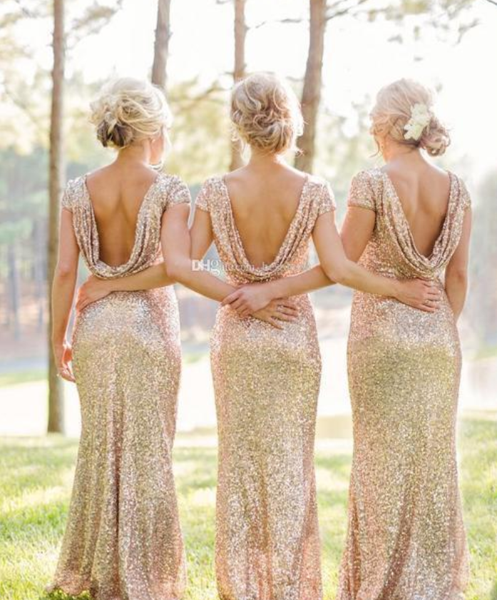 Modest Mermaid Rose Gold Cheap Bridesmaid Dress Real Picture Gold Sequined Backless Formal Party Prom Evening Dress