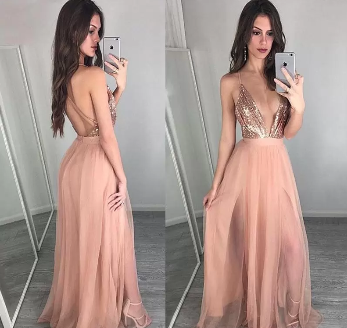 Sexy Rose Gold Bridesmaid Dresses Deep V-neckline Pink Tulle Long Prom Dresses Backless Sequins Maid Of Honor Party Dress