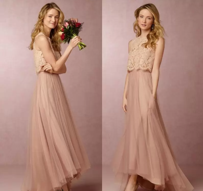 Vintage Blush Pink Two Pieces Bridesmaid Dresses Lace Crop High Low Beach Bridesmaid Dresses Wedding Party Gowns