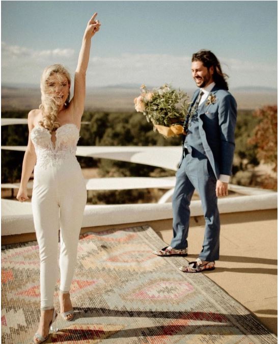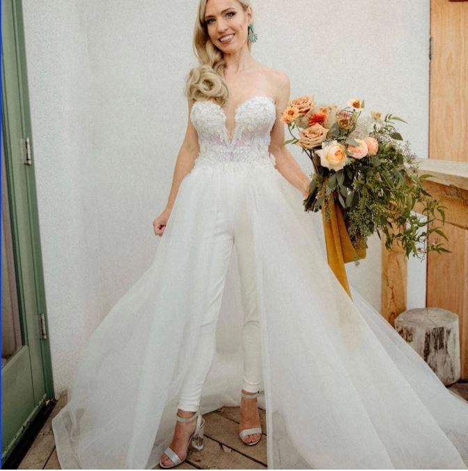 A Line Bridal Jumpsuit Wedding Dress with Detachable Train Lace Sweetheart Wedding Gowns