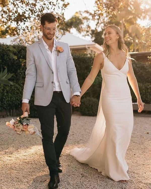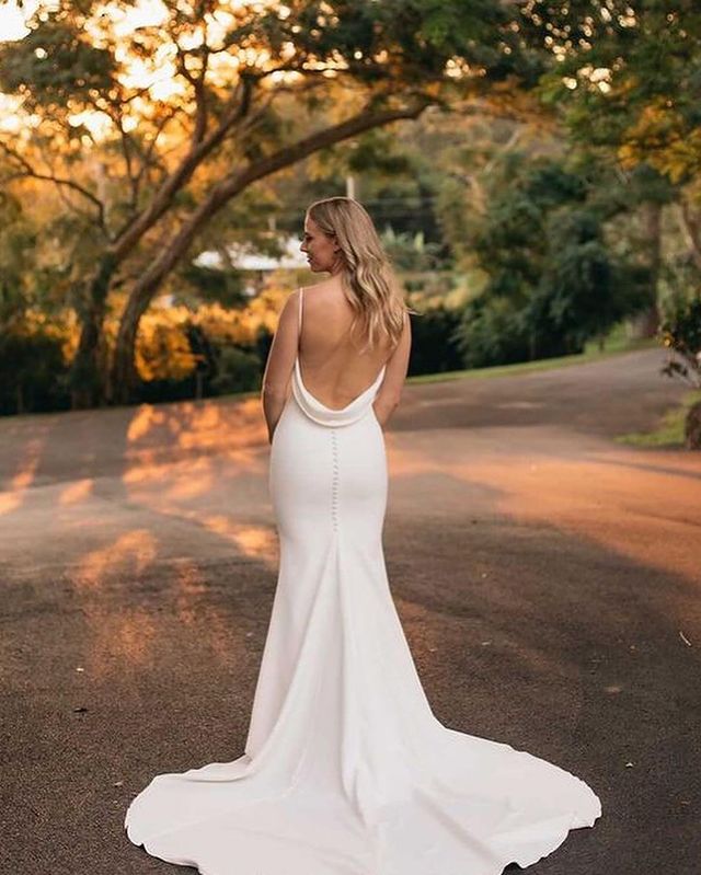 Simple Mermaid V Neck White Soft Satin Wedding Dress