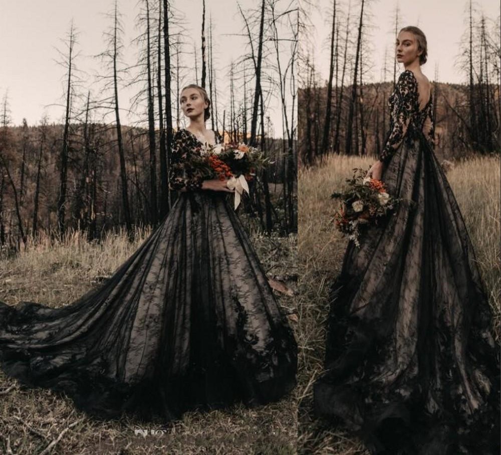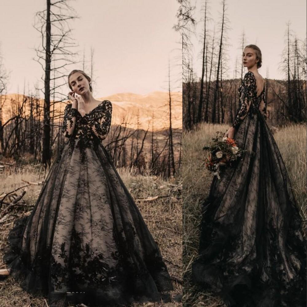 Gothic Black Vintage Wedding Dresses A Line V Neck Lace Appliques Tulle Illusion Backless Sweep Train Plus Size Formal Bridal Gown