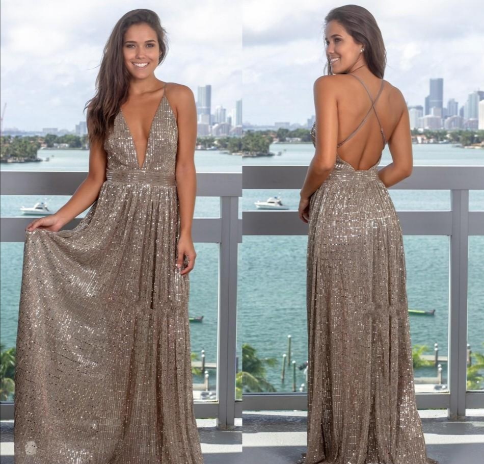 Modest Silver Sequined Prom Dresses Sexy Deep V Neck Evening Party GownDresses Sleeveless Open Back Evening Gowns