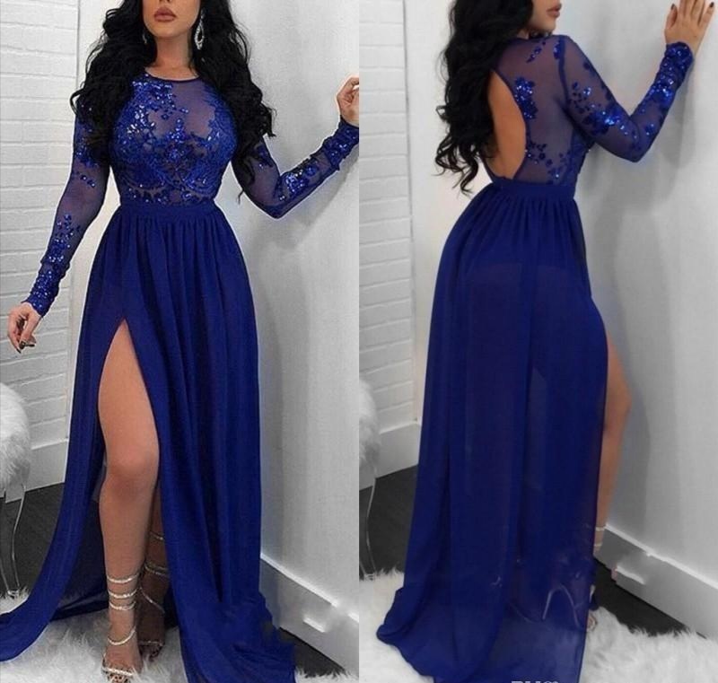 Sheer Long Sleeves Royal Blue Mermaid Prom Dresses Mermaid Sequins Appliques Side Split Evening Gowns
