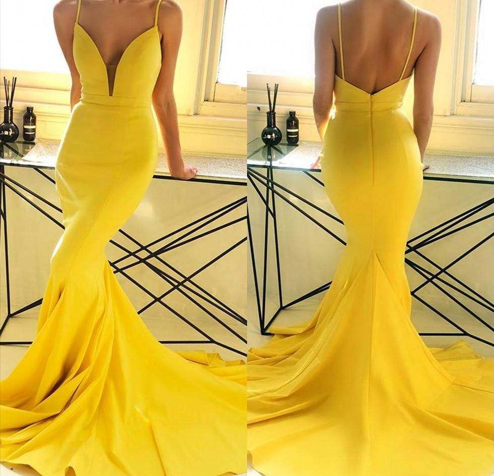 Yellow Spaghetti Straps Satin Mermaid Prom Dresses Ruched Plus Size Maid Of Honor Sweep Train Party Evening Gowns