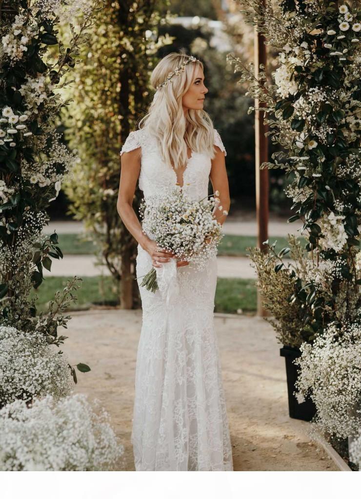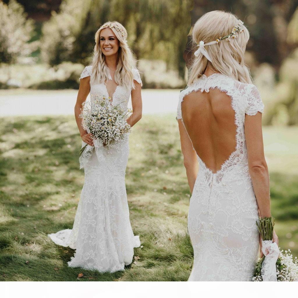 Berta Bohemian Cap Sleeved With Pearls Mermaid Wedding Dresses Backless Sweep Train Garden Beach Bridal Gowns