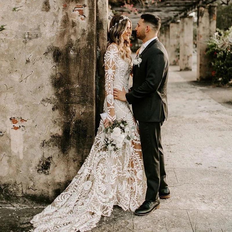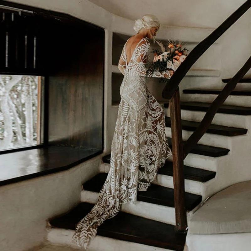 Bohemian Full Lace Beach Wedding Dresses Bridal Gowns Long Sleeve Low Backless Chic Noivas Boho Rue de Soriee