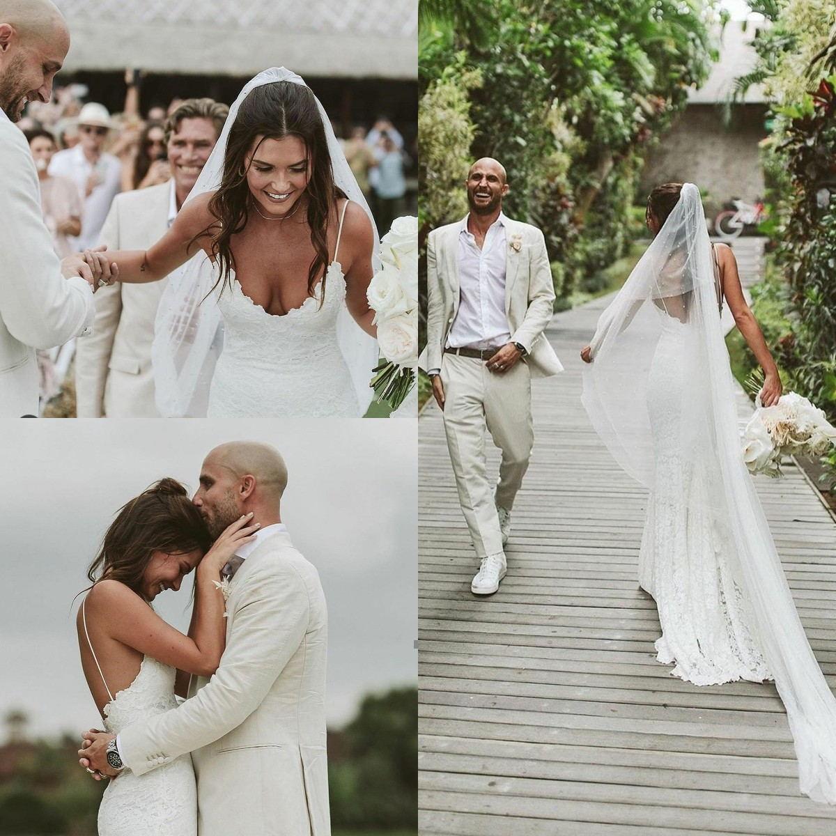 Bohemian Mermaid Wedding Dresses Spaghetti Straps Backless Sweep Train Lace Bridal Gowns