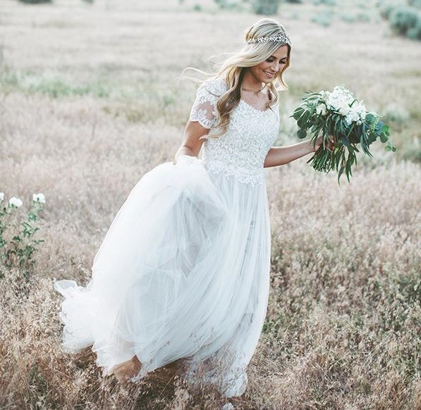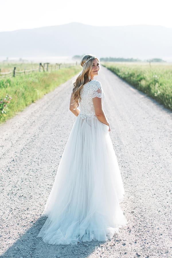 Lace Top Tulle Skirt Boho Modest Wedding Dresses With Short Sleeves A-line Short Train Scoop Neck Women Bohemian Bridal Gowns