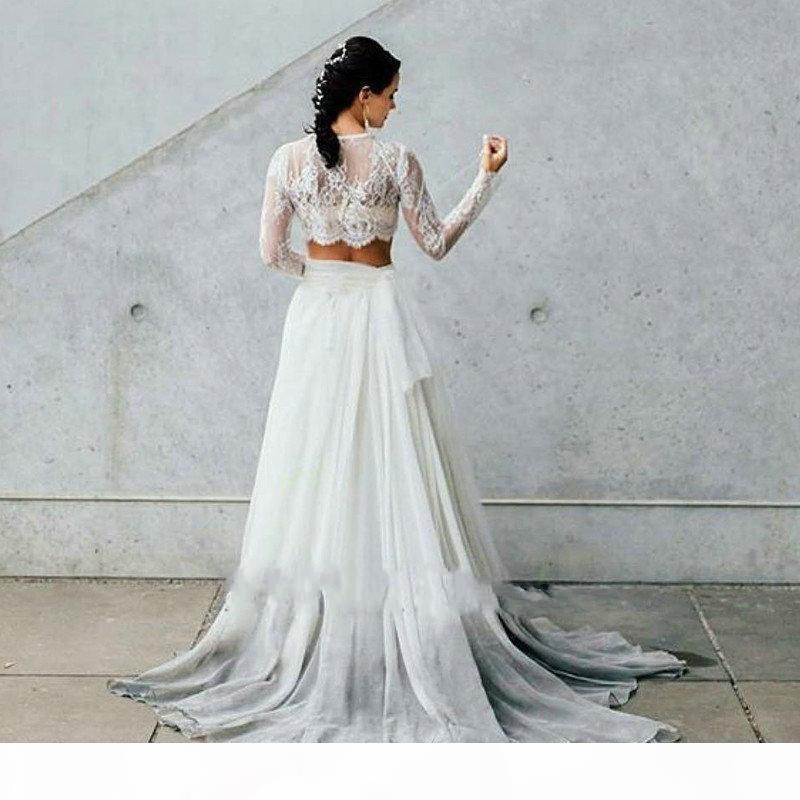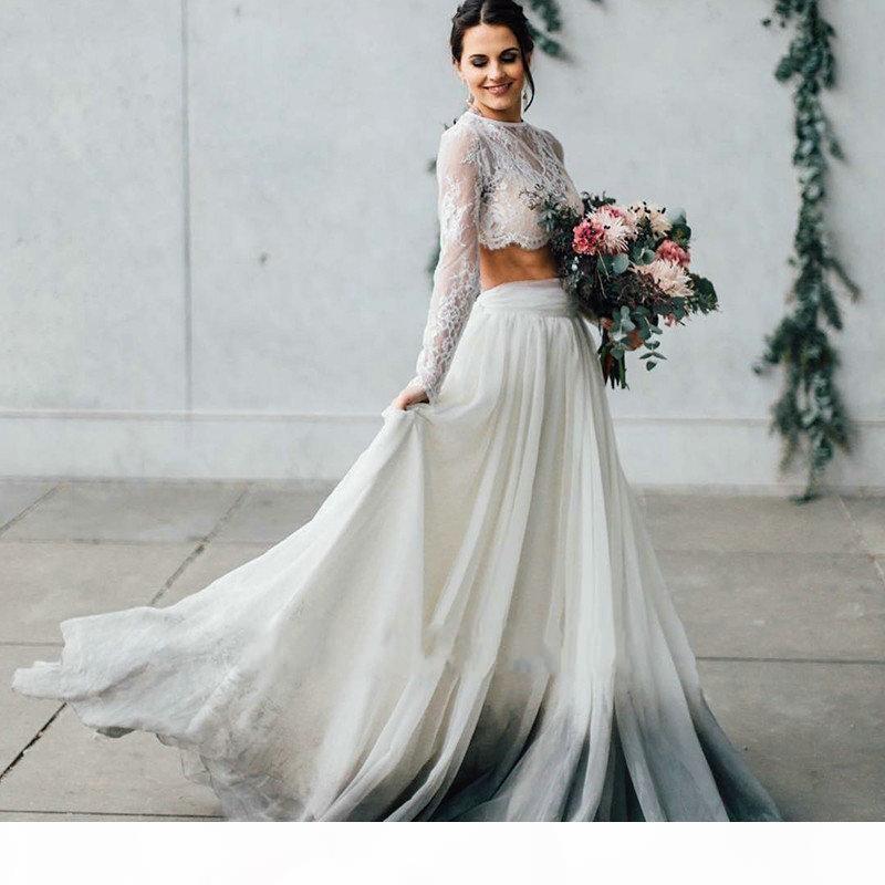 Spring Summer Two Piece Wedding Dresses with Long Sleeves A Line Chiffon Boho Lace Bride Dresses Beach Style Bohemian