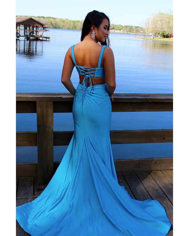 Charming Mermaid Scoop Neck Lake Blue Satin Long Prom Dress
