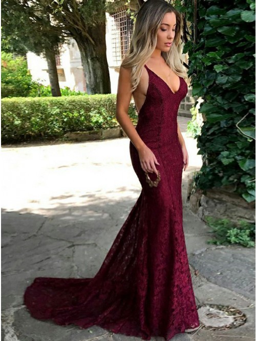 Mermaid Spaghetti Straps Backless Sweep Train Burgundy Lace Prom Dress
