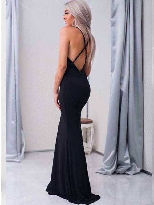 Simple Mermaid V-Neck Criss-Cross Straps Floor-Length Black Prom Dress