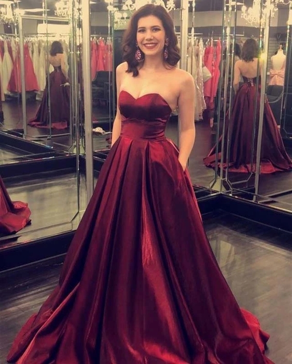 Simple A-Line Sweetheart Burgundy Satin Long Prom Evening Party Dress