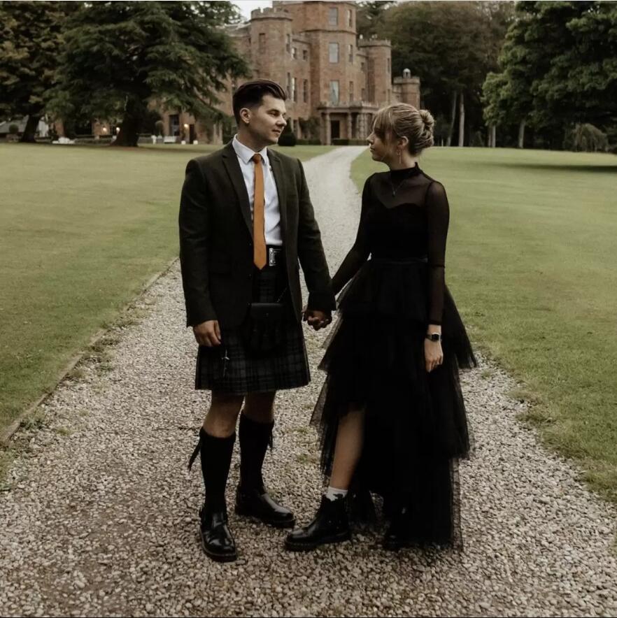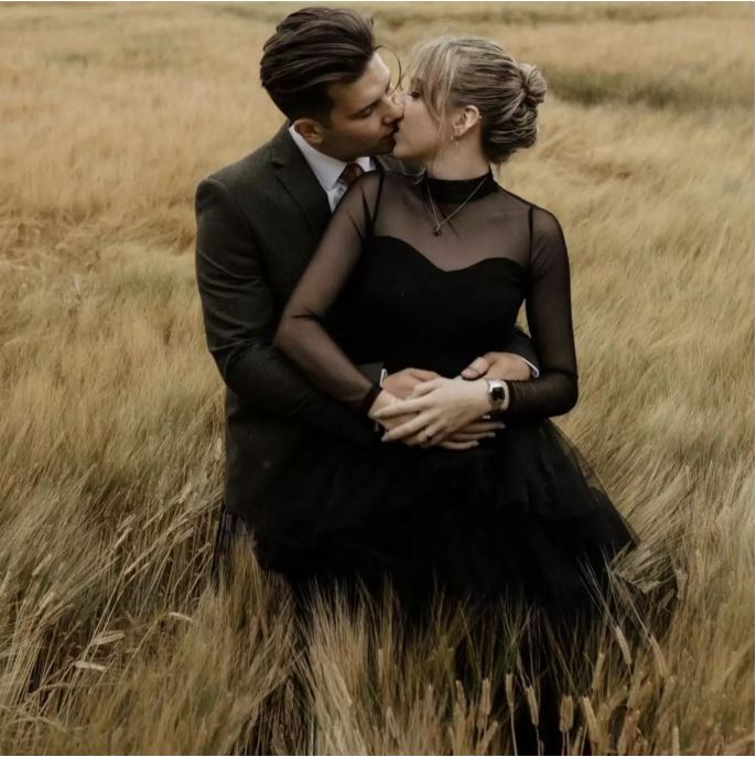 Gothic Black Wedding Dresses Bridal Gowns High Neck Full Sleeve Layered Tulle Skirt A Line Vintage Vestidos De Noiva Short Front Long Back