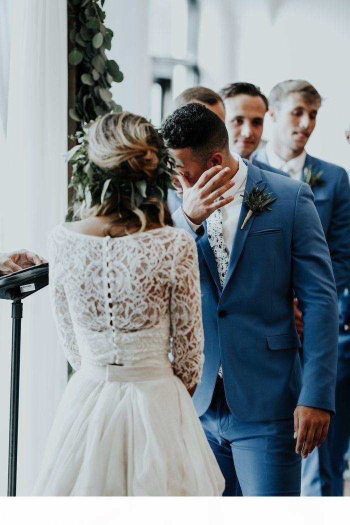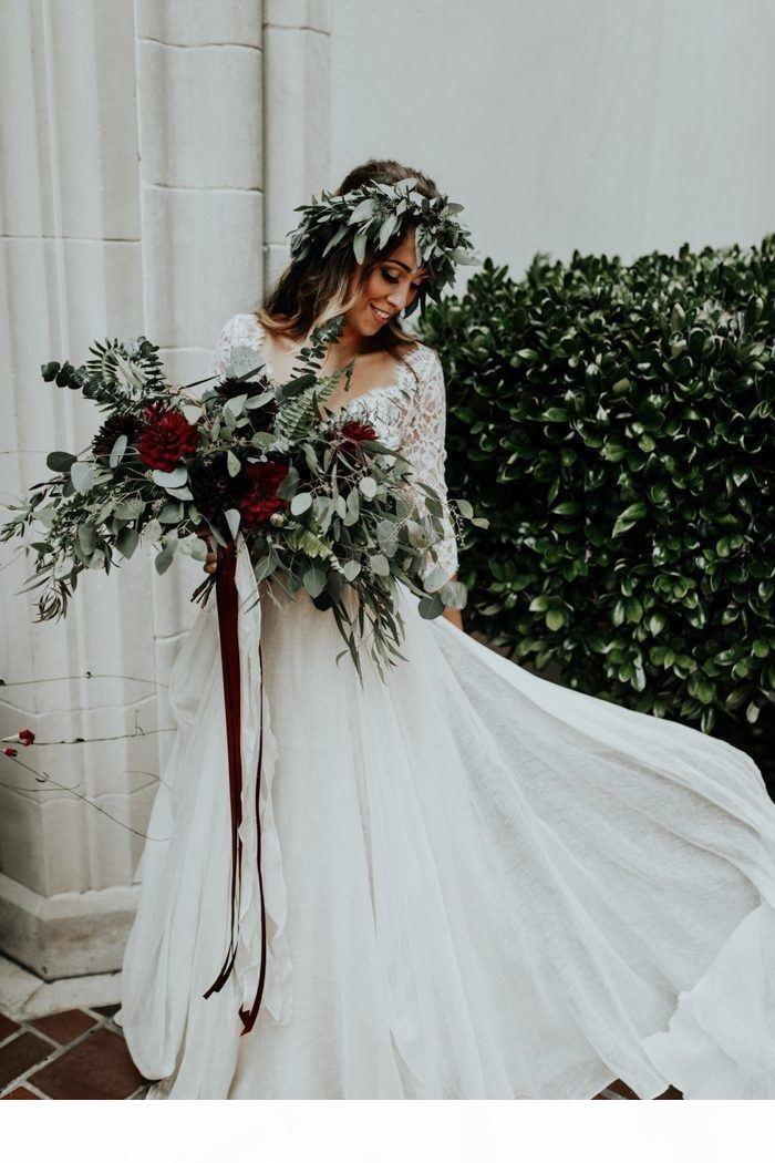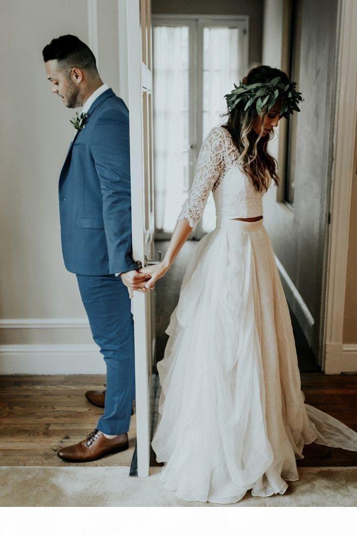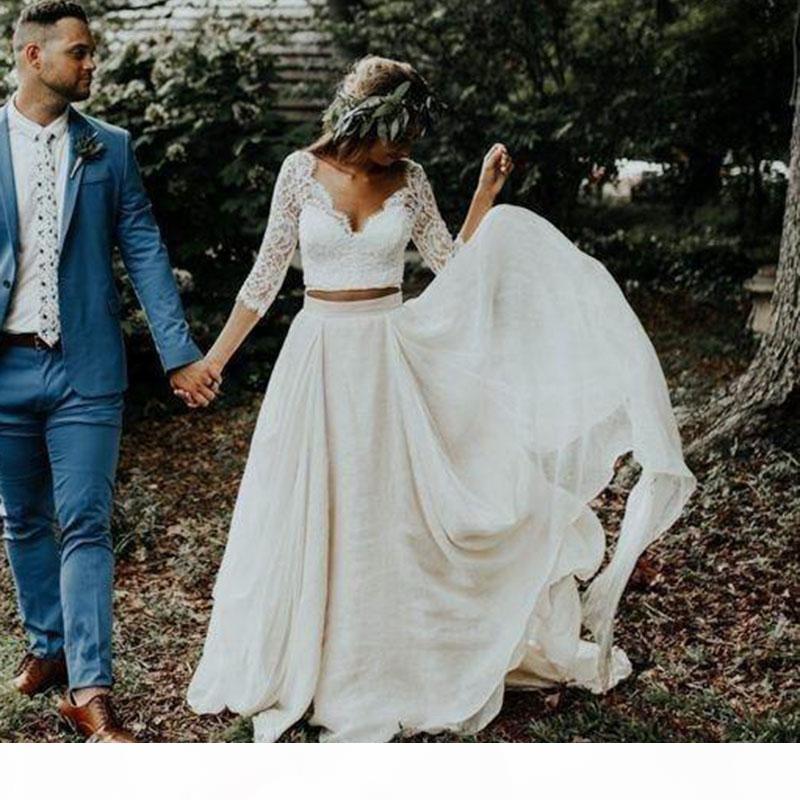 Modest Two Pieces Wedding Dresses Lace V Neck 3/4 Long Sleeves Bohemian Bridal Gowns