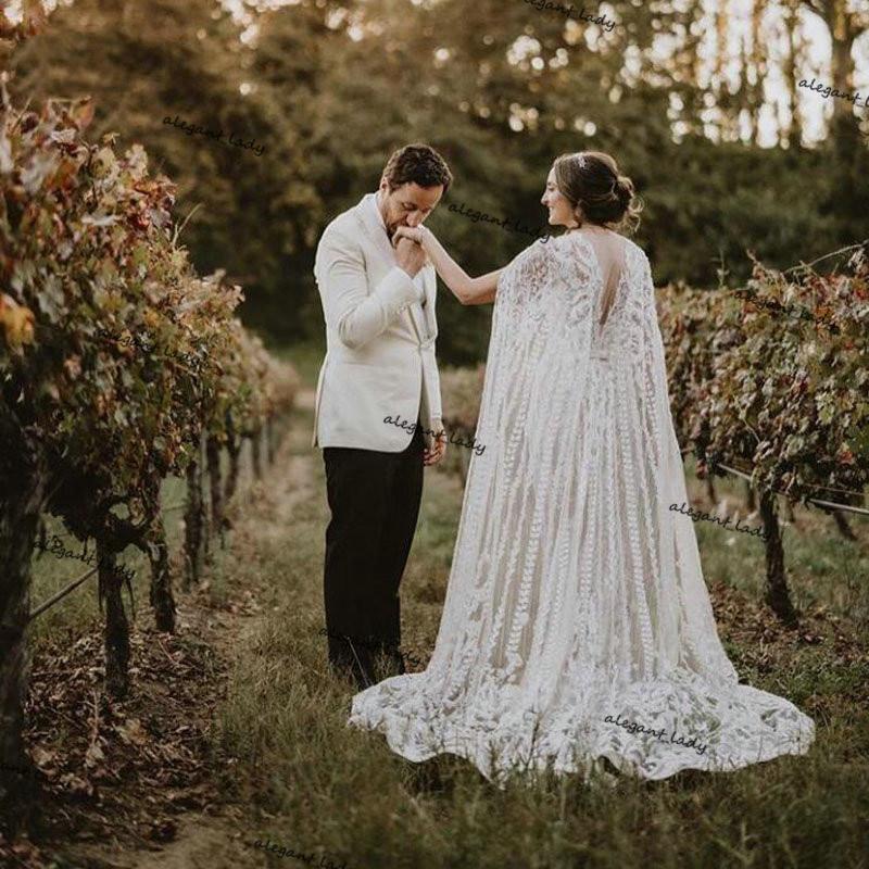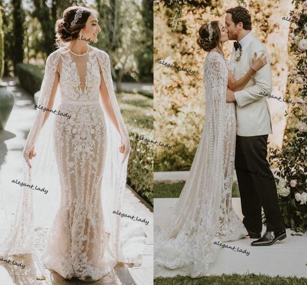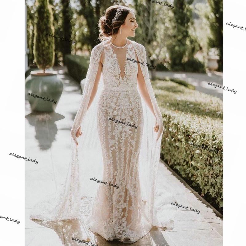 Illusion Back Farm Mermaid Wedding Dresses With Cape lace Appliques Long Country bohemian Bridal Wedding Dress