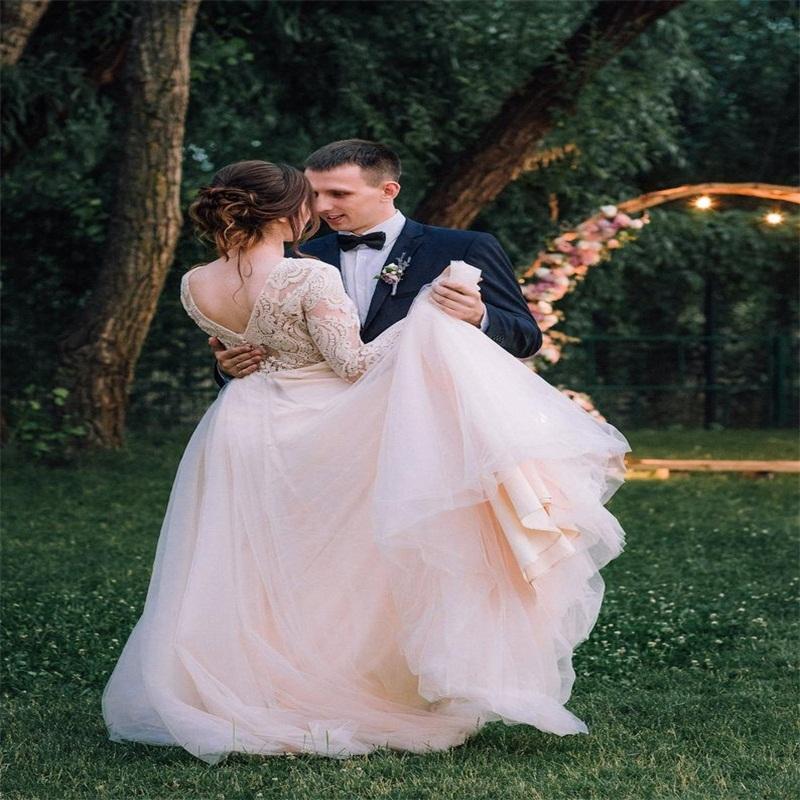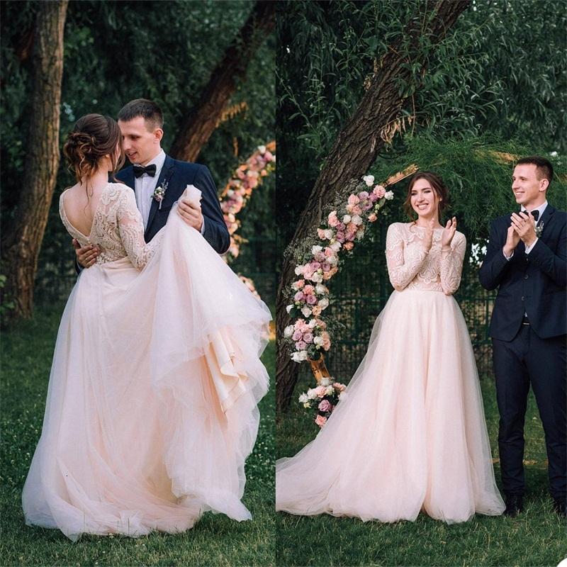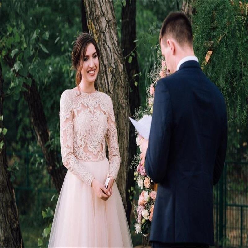 Gorgeous Beach Wedding Dresses A Line Jewel Long Sleeves Cheap Custom Made Lace Applique Ruched Tulle Bohemian Bridal Gowns