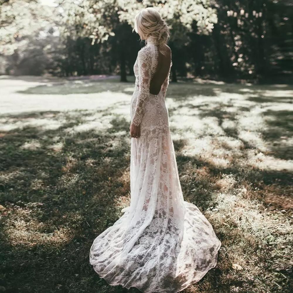 Hottest Wedding Dresses Bohemian High Neck Lace Long Sleeve Bridal Gowns Boho Sexy Backless Plus Size Wedding Dress