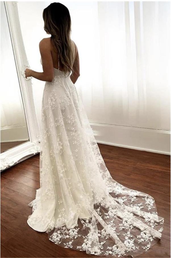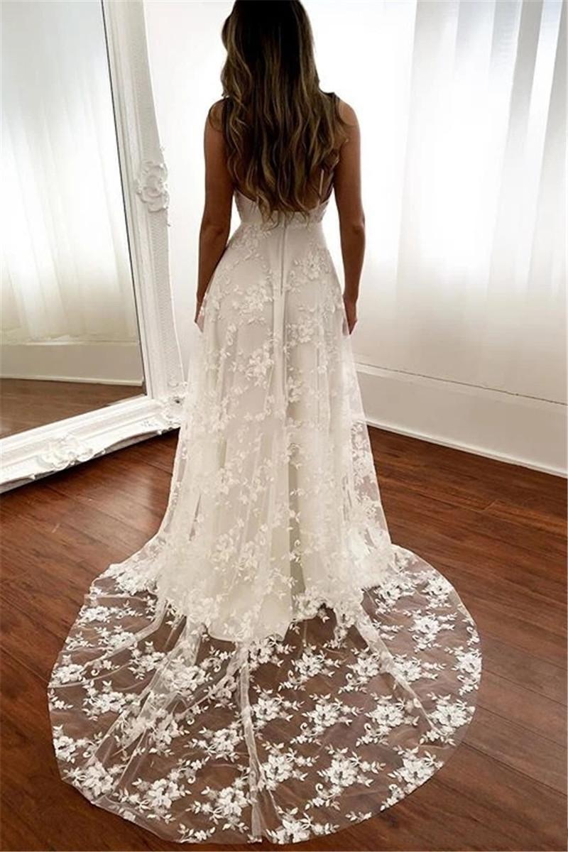 Charming Lace A Line Wedding Dresses Spaghetti Appliques Bridal Dress Sweep Train Backless Customize Garden Wedding Dress