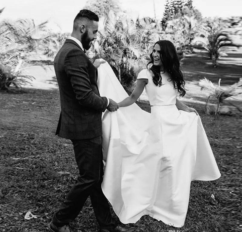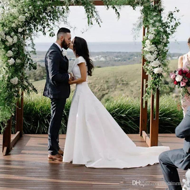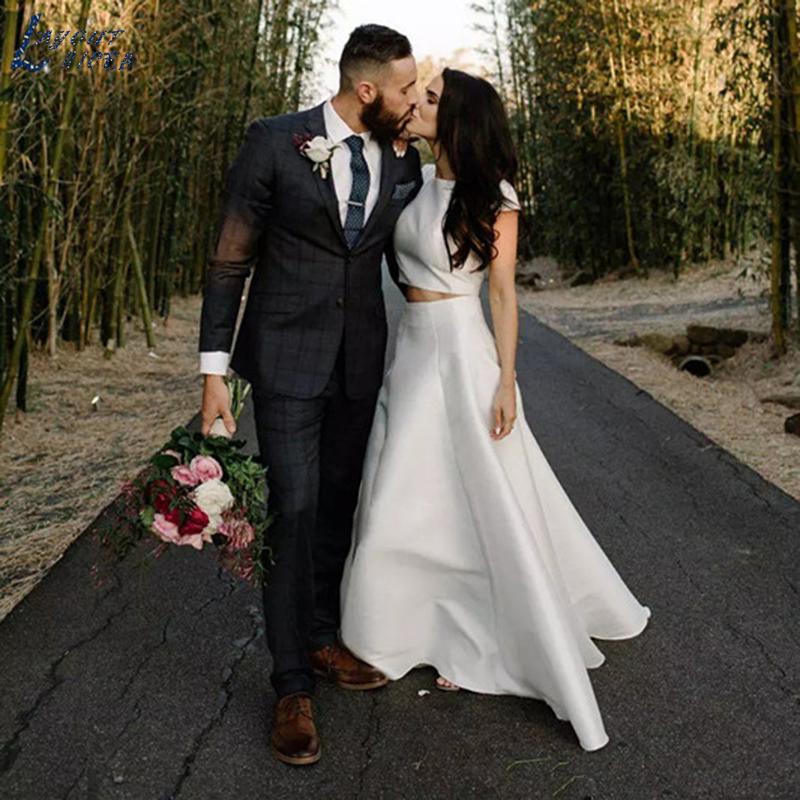 Simple Two Pieces Cap Sleeve Long Satin Boho Wedding Dress Scoop Sleeveless Country Bridal Wedding Dresses