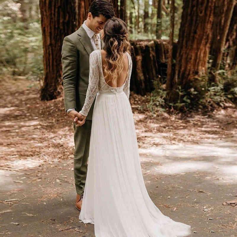 Lace Boho Wedding Dresses for Women Bride Long Sleeve Backless A-Line Chiffon Bohemian Bridal Gowns
