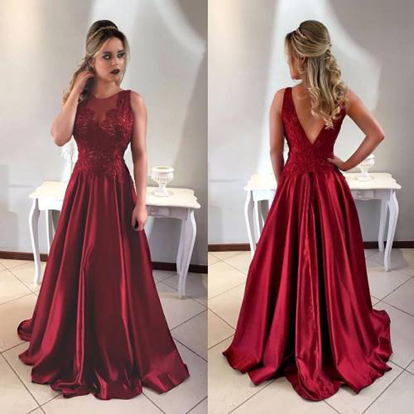 Burgundy Satin Prom Dress, Appliques V Back Prom Dresses