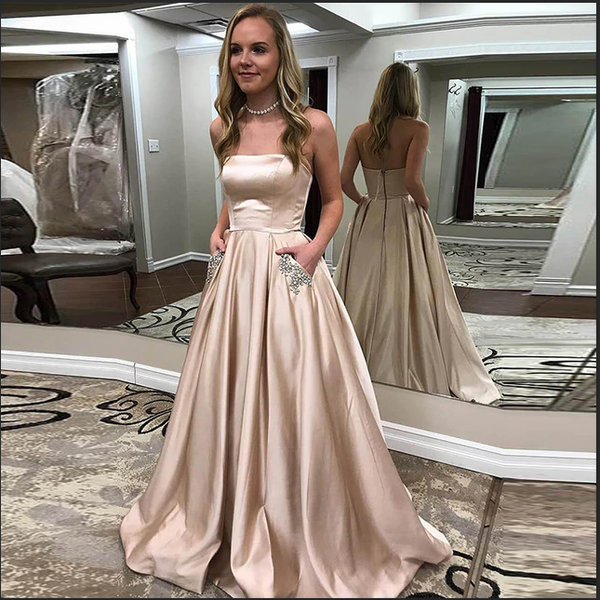 Fashion Strapless A Line Elegant Long Prom Dresses Formal Fancy Grad Dress With Pocket Evening Gowns