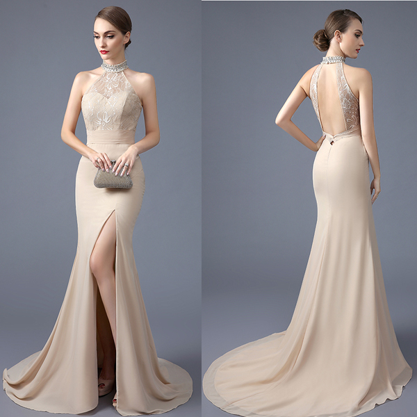 New Arrival Backless Champagne Mermaid Prom Dresses,High Neck Front Slit Lace Evening Dress