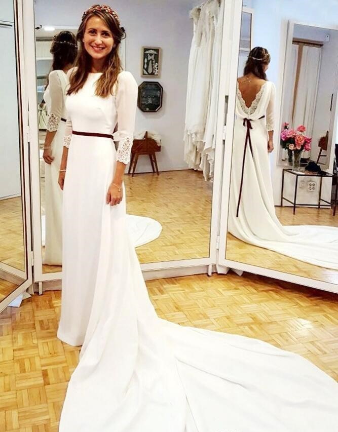 A-line Wedding Dresses Bridal Gowns Beach Bohemian White Long Sleeves Lace Chiffon Bridal Dresses With Sashes Sweep Train