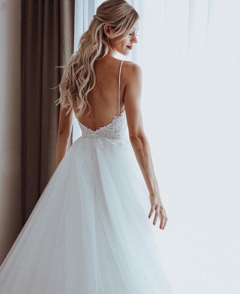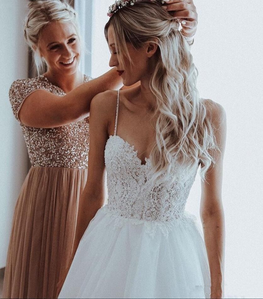 Beach Backless Wedding Dresses Spaghetti Straps A-Line Summer Lace Appliques Pearls Floor Length Bridal Gown