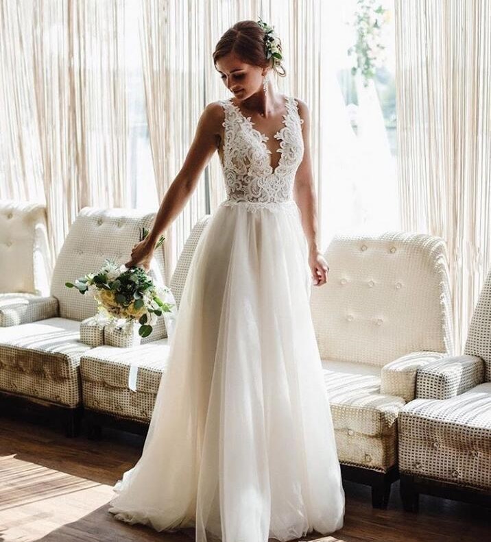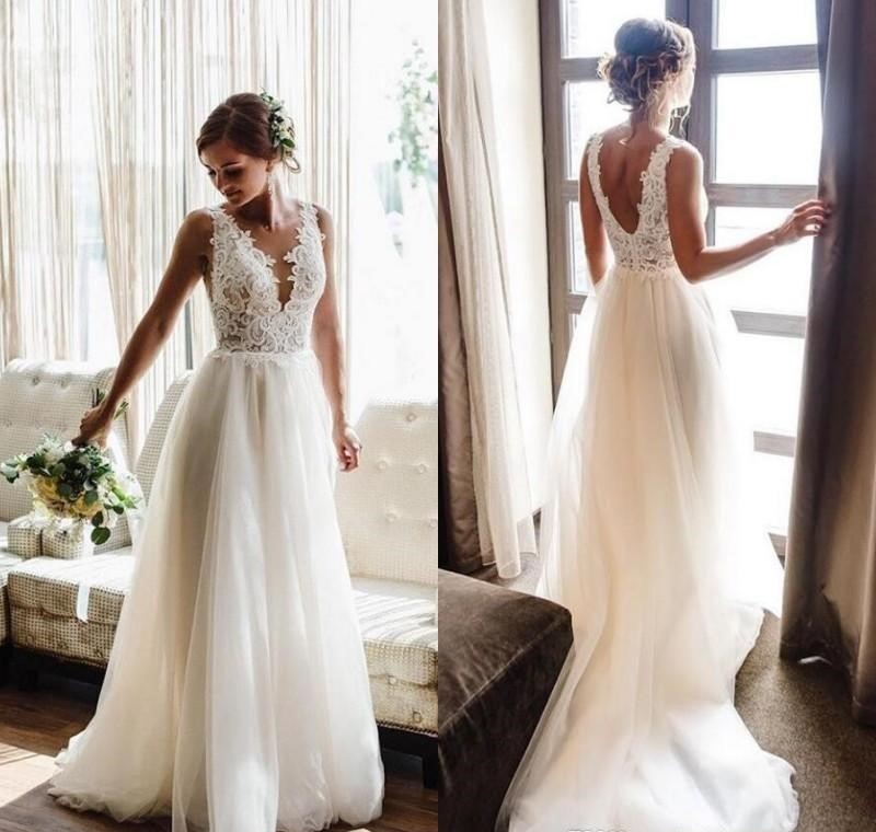 Country V Neck Sleeveless Tulle Wedding Dresses Bohemian A Line Sweep Train Boho Bridal Gowns With Lace