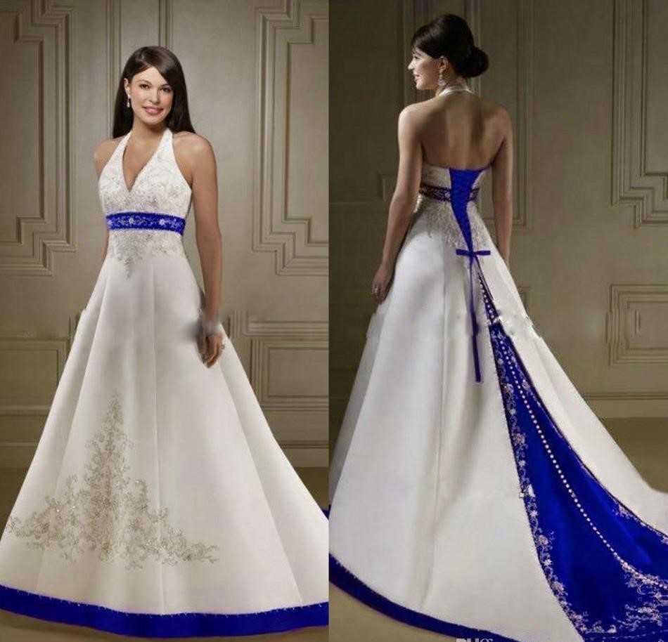 New Ivory and Royal Blue Satin A Line Wedding Dresses Halter Neck Open Back Lace Up Court Custom Made Embroidery Wedding Bridal Gowns