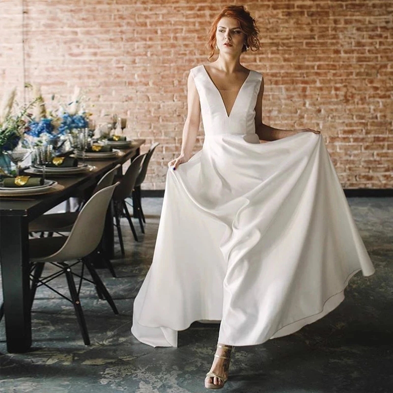 Other Wedding Dresses Tout An Satin Dress A Line V Neck Deep Open Back Bridal Gowns Sleeveless Sweep Train