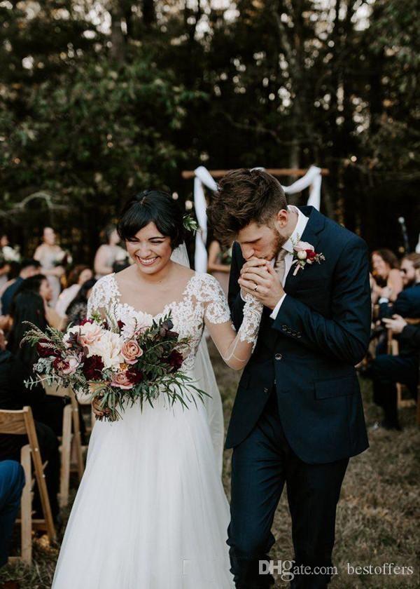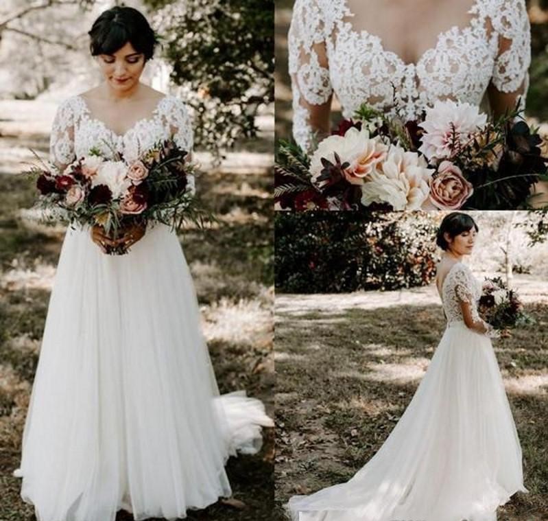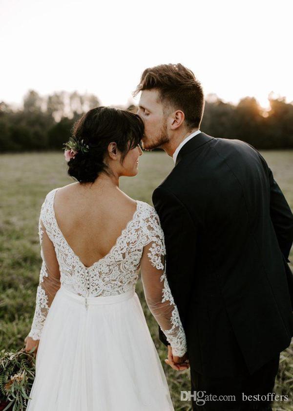 Vintage Country Weddng Dresses A Line V Neck Long Sleeve Sweep Train Bridal Gowns With Lace Tulle Backless Wedding Gowns Bridal Dresses