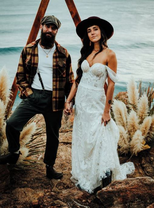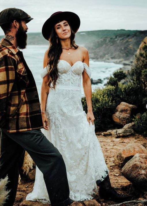 Bohemian wedding dress, elegant sleeveless shoulder lace wedding dress