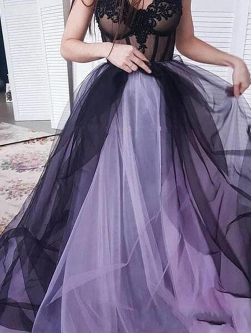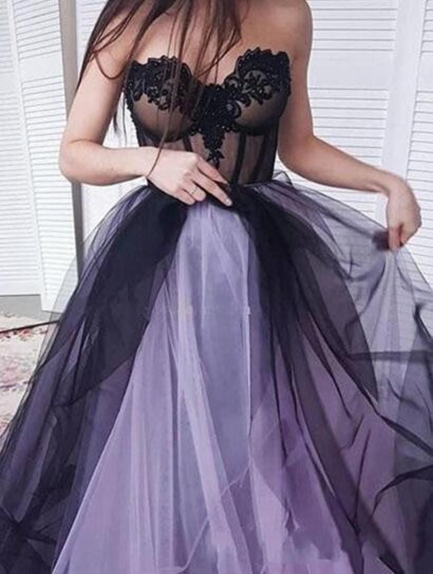Purple and Black Gothic A Line Wedding Dresses Strapless Appliques Lace Tulle Plus Size Wedding Dress Bridal Gowns