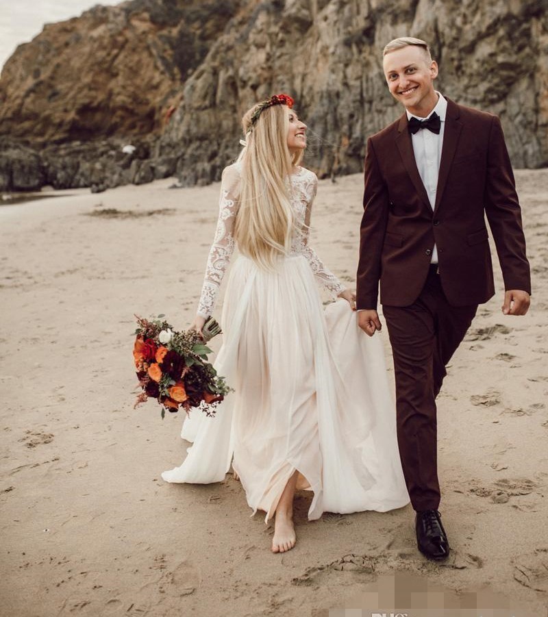 Beach Wedding Dresses Long Sleeves Jewel Neck Lace Applique Chapel Train Chiffon Custom Made Boho Wedding Gown
