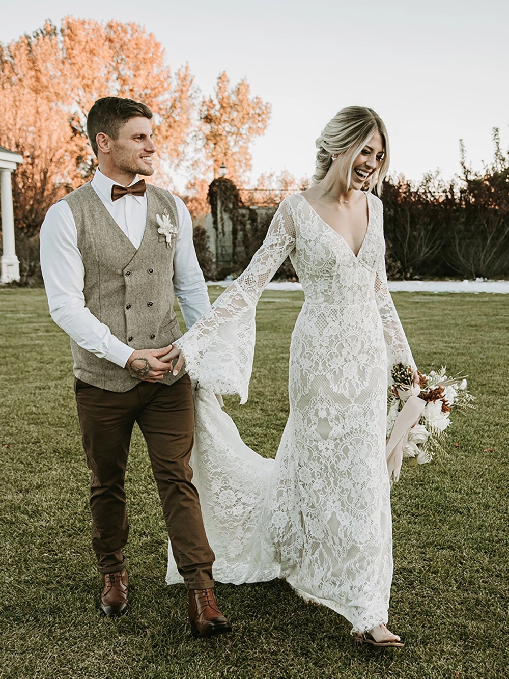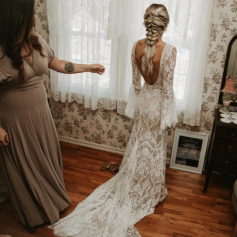 Sexy Wedding Dresses Full Floral Lace V Neck Long Sleeves Boho Bridal Mermaid Gowns