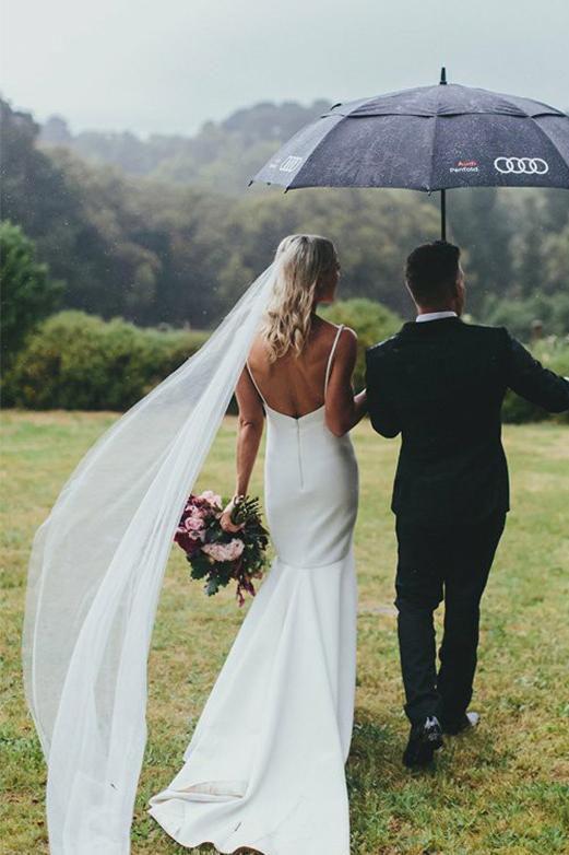 Simple Deep V Neck Sweep Train Mermaid Satin Wedding Dress