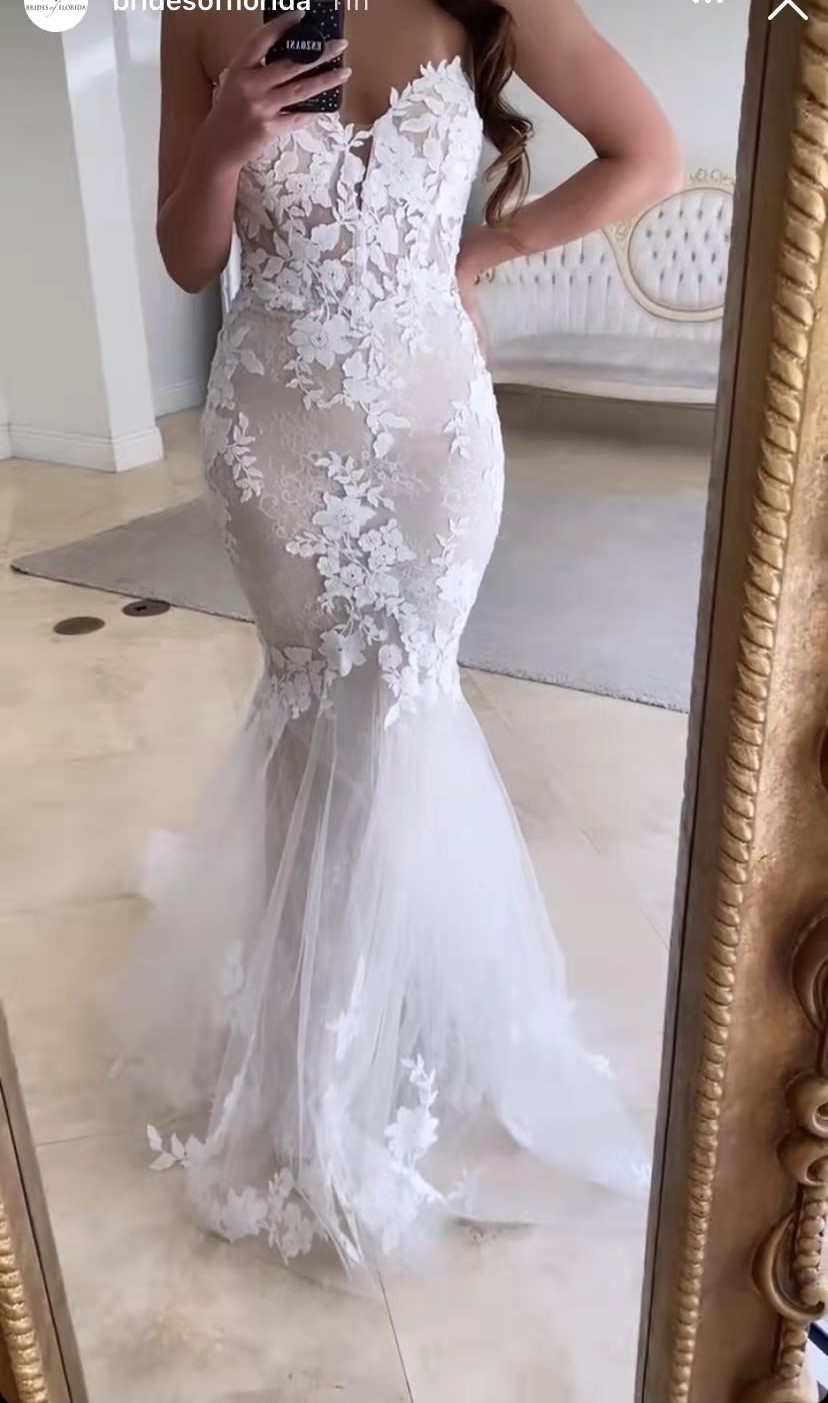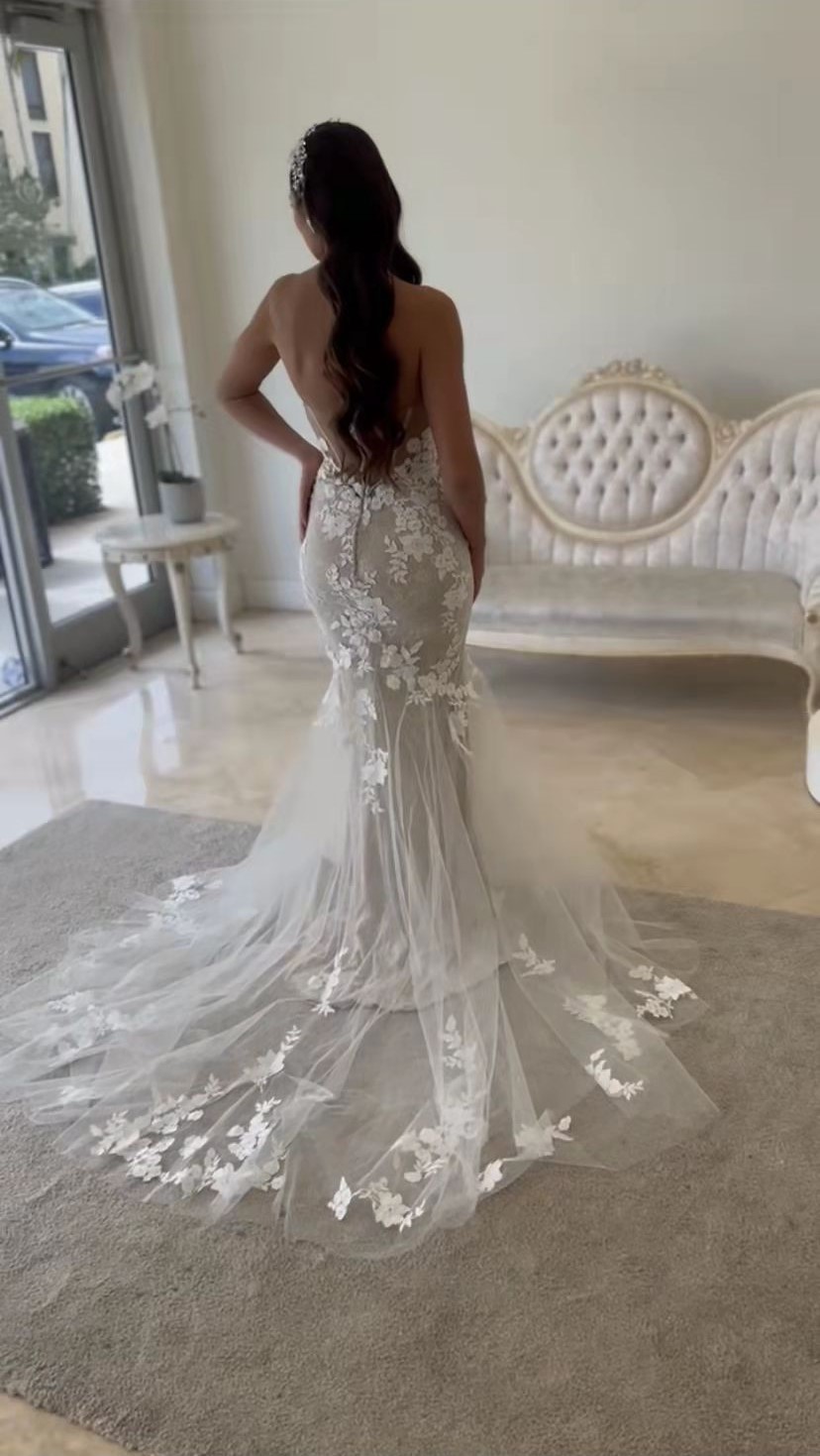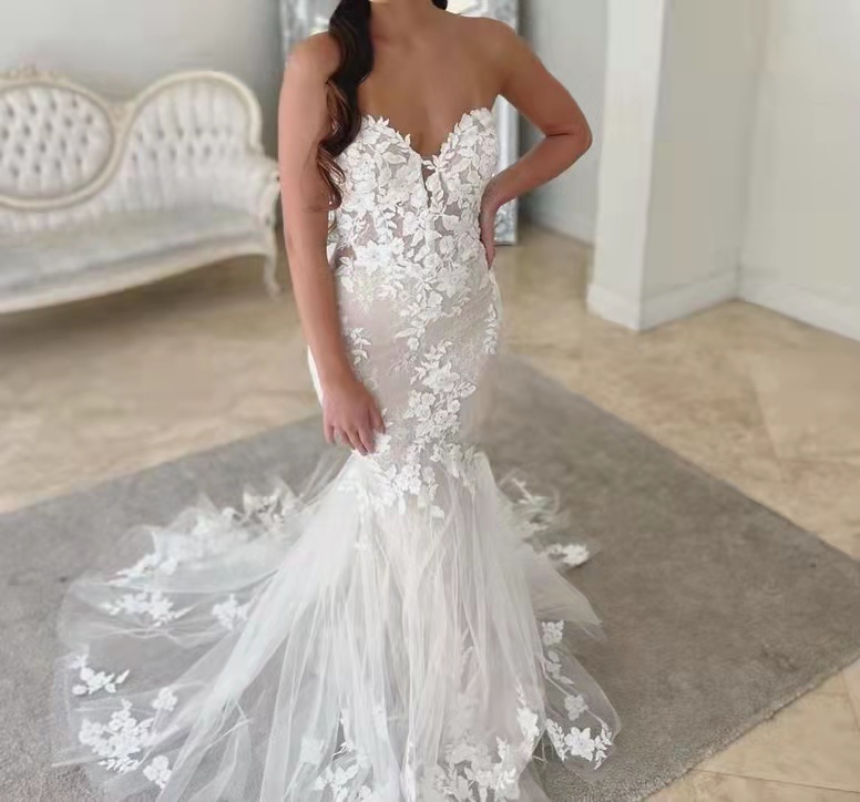 Bohemian wedding dress, simple sleeveless lace applique strapless wedding dress