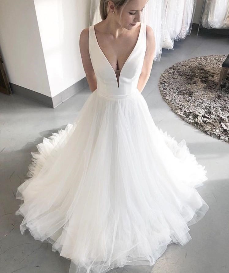 Simple Beach Wedding Dresses Deep V-neck Sleeveless Bridal Dresses Satin Top Tulle Skirt Custom Made White Ivory Wedding Gowns