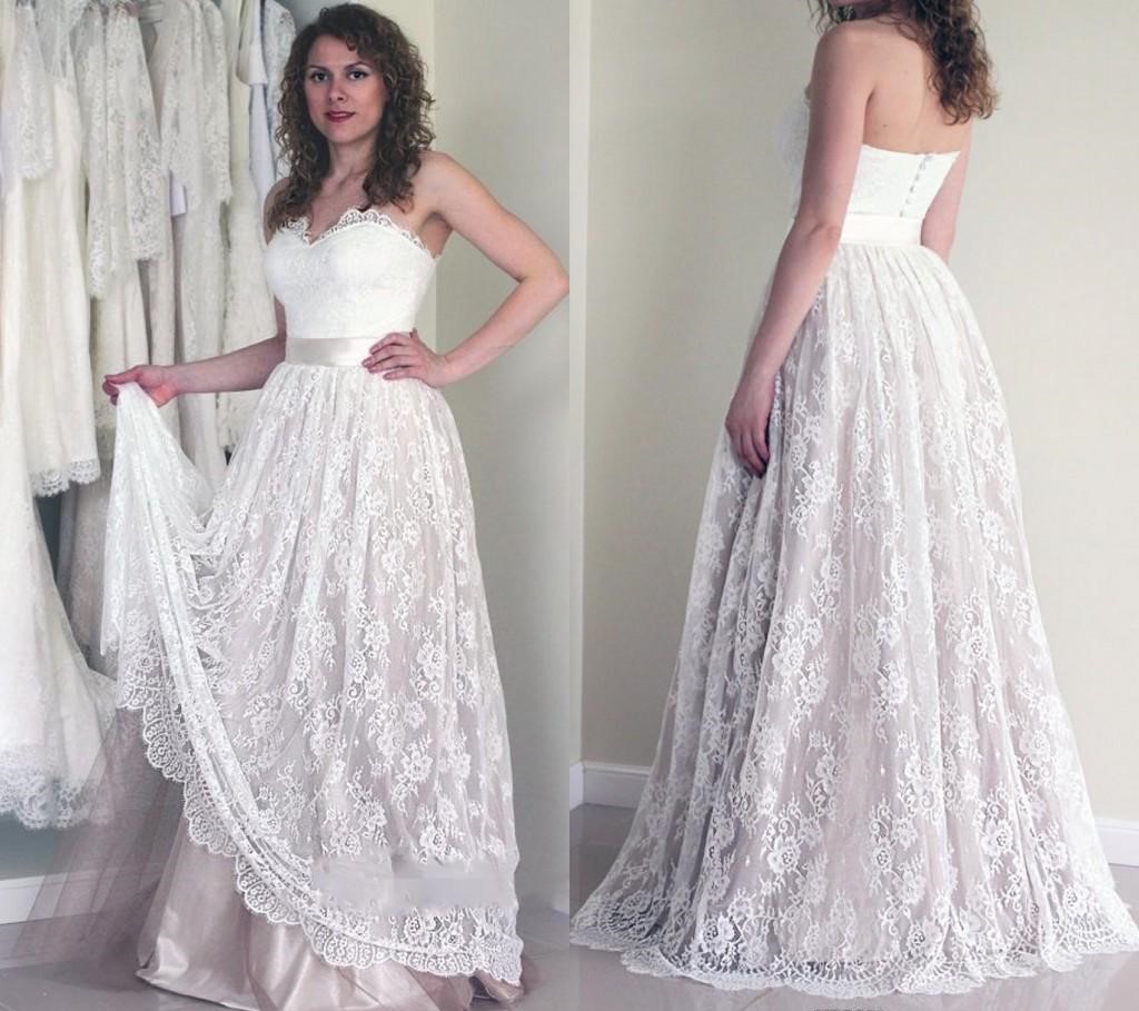 Simple Sleeveless Mermaid Wedding Dresses Cheap Lace A-line Long Sweetheart Sash Tiered Skirts Floor-Length Covered Button Wedding Gowns