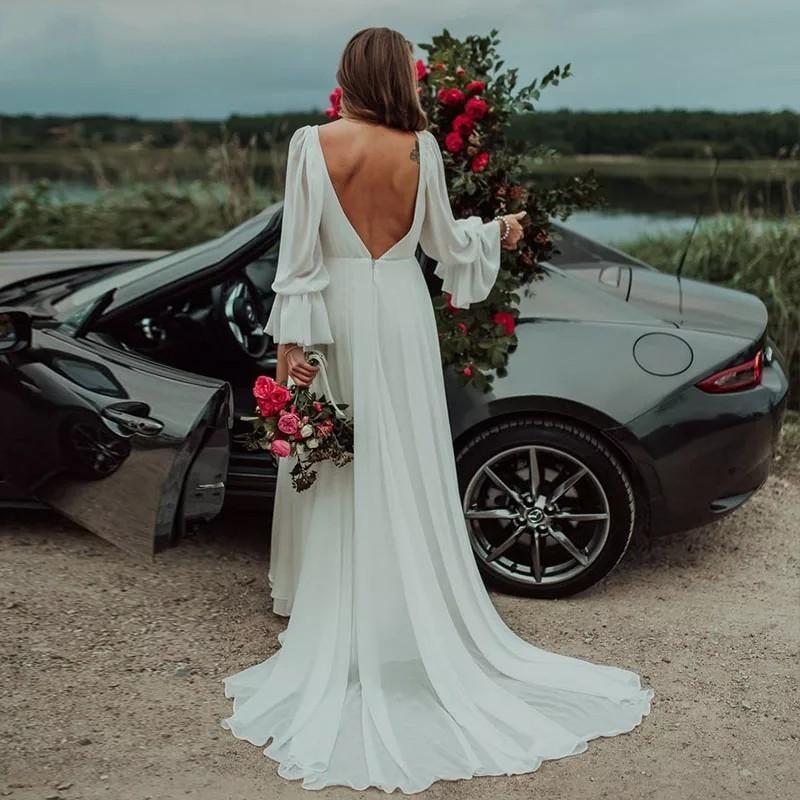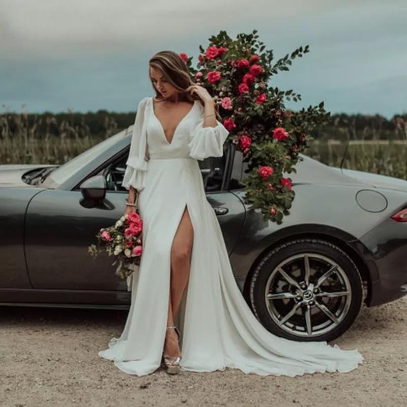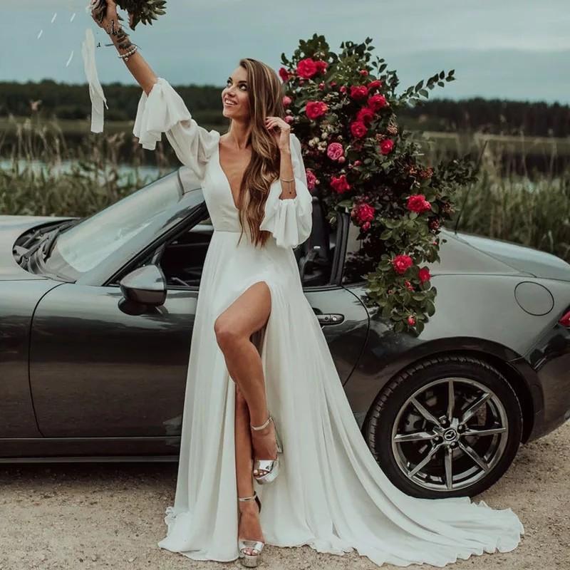 Sexy Bohemain Plunging V Neck Wedding Dress Long Sleeve Split A Line Chiffon Beach Bridal Gown